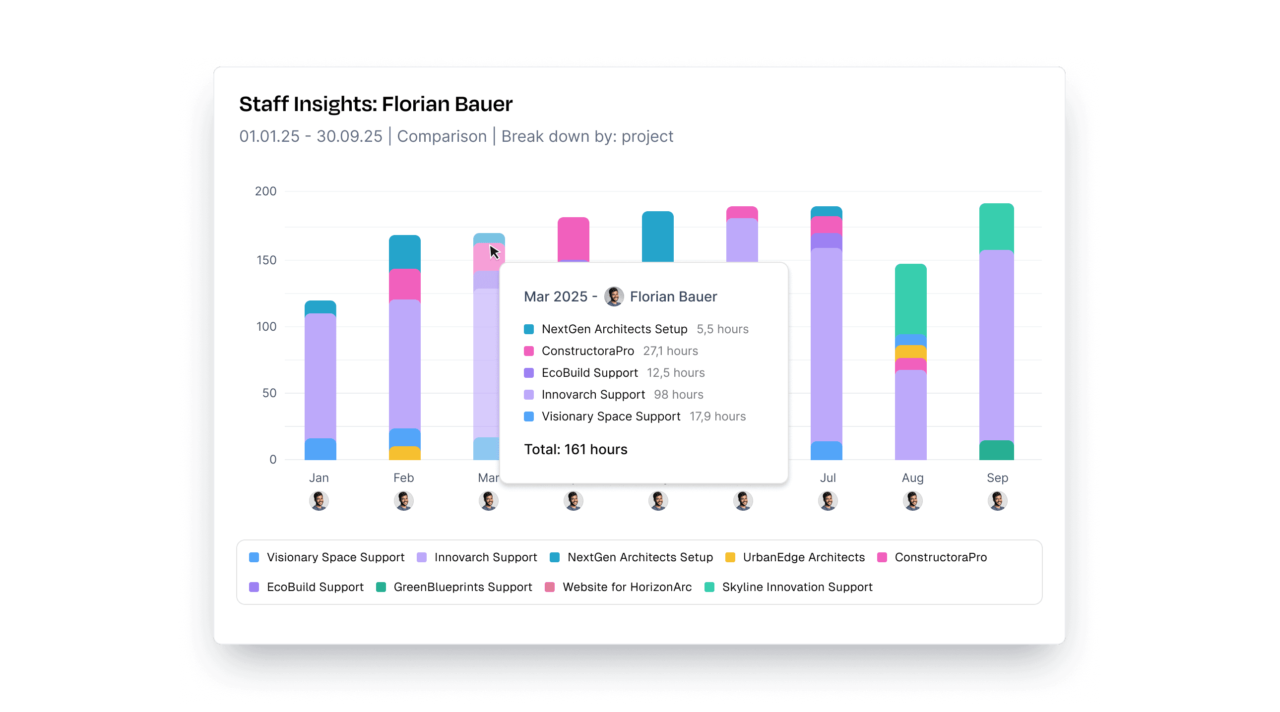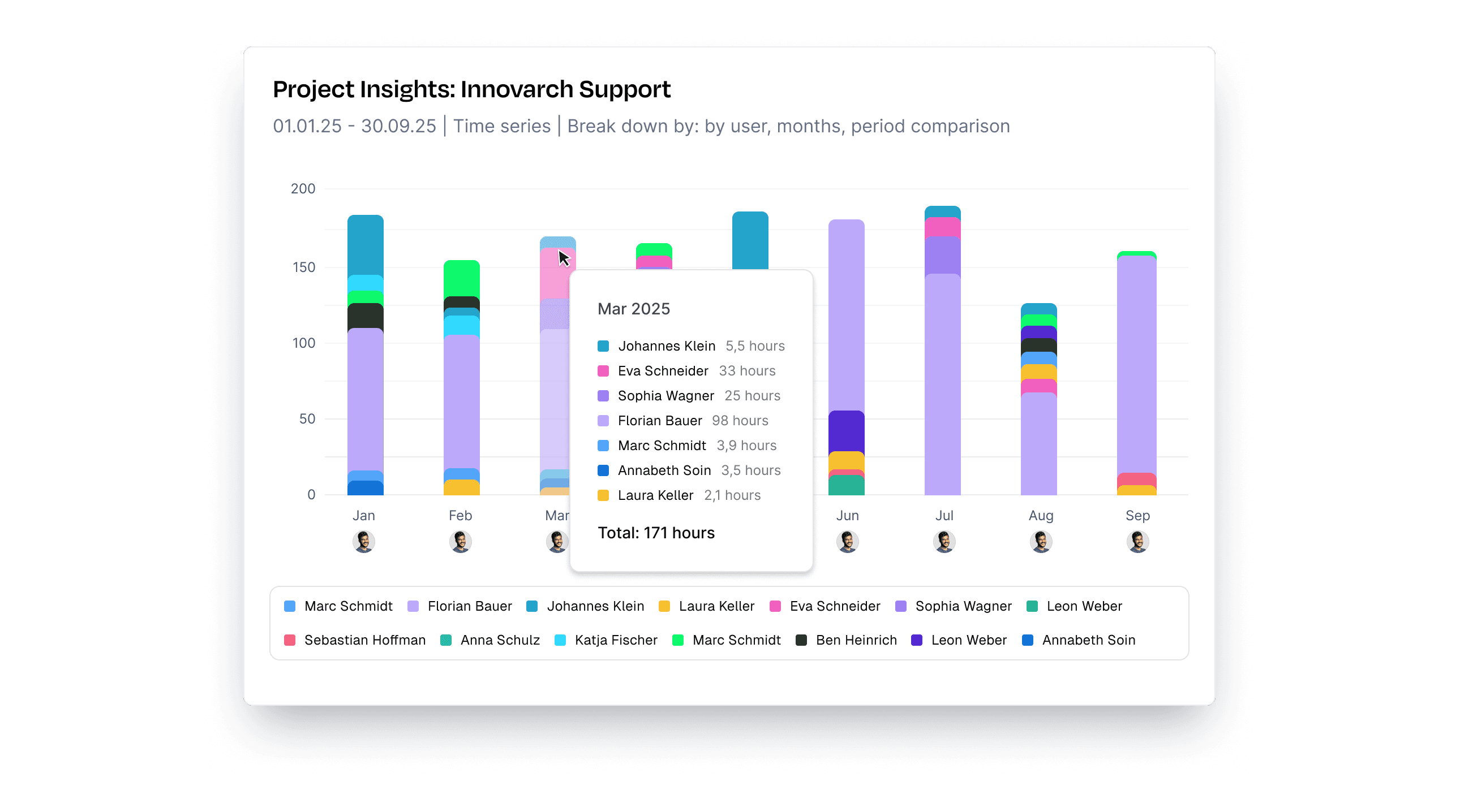 With Project Insights you see at a glance how your time is distributed over weeks and months:
