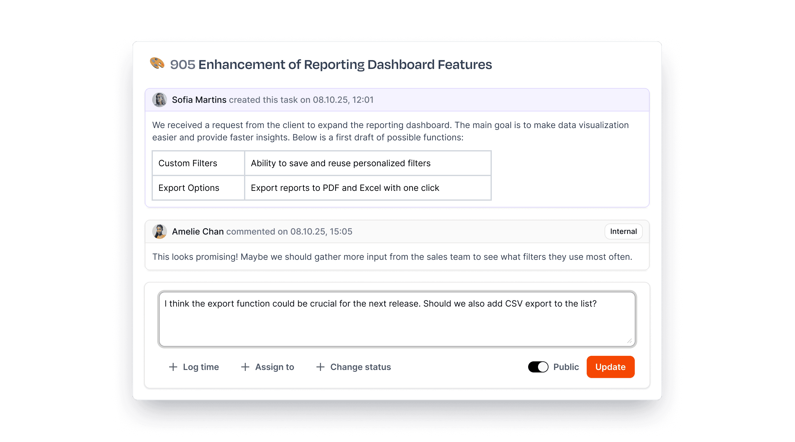 All communication happens in the context of work. Every ticket, every task, every change request has its own comments, updates, decisions. Everything is transparent, structured, and never buried in someone's inbox.