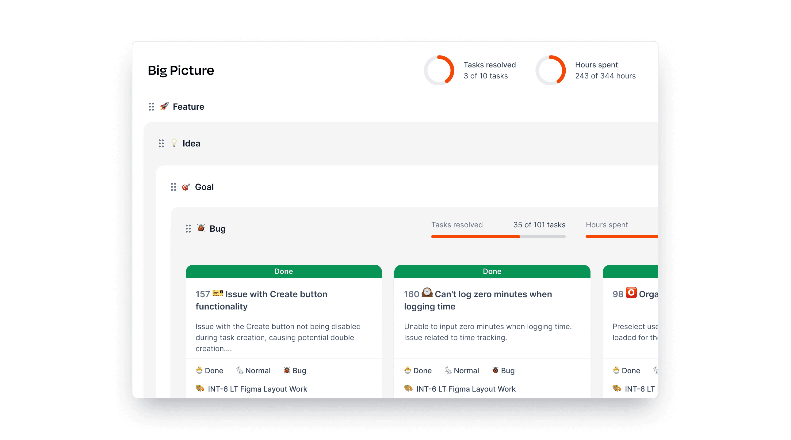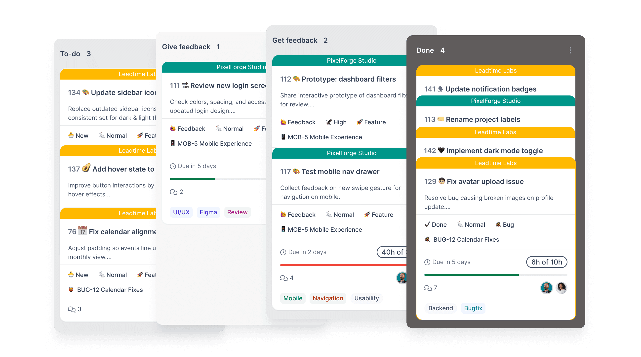 Every ticket has clear states: "To Do," "In Progress," "Feedback," "Review," "Done."