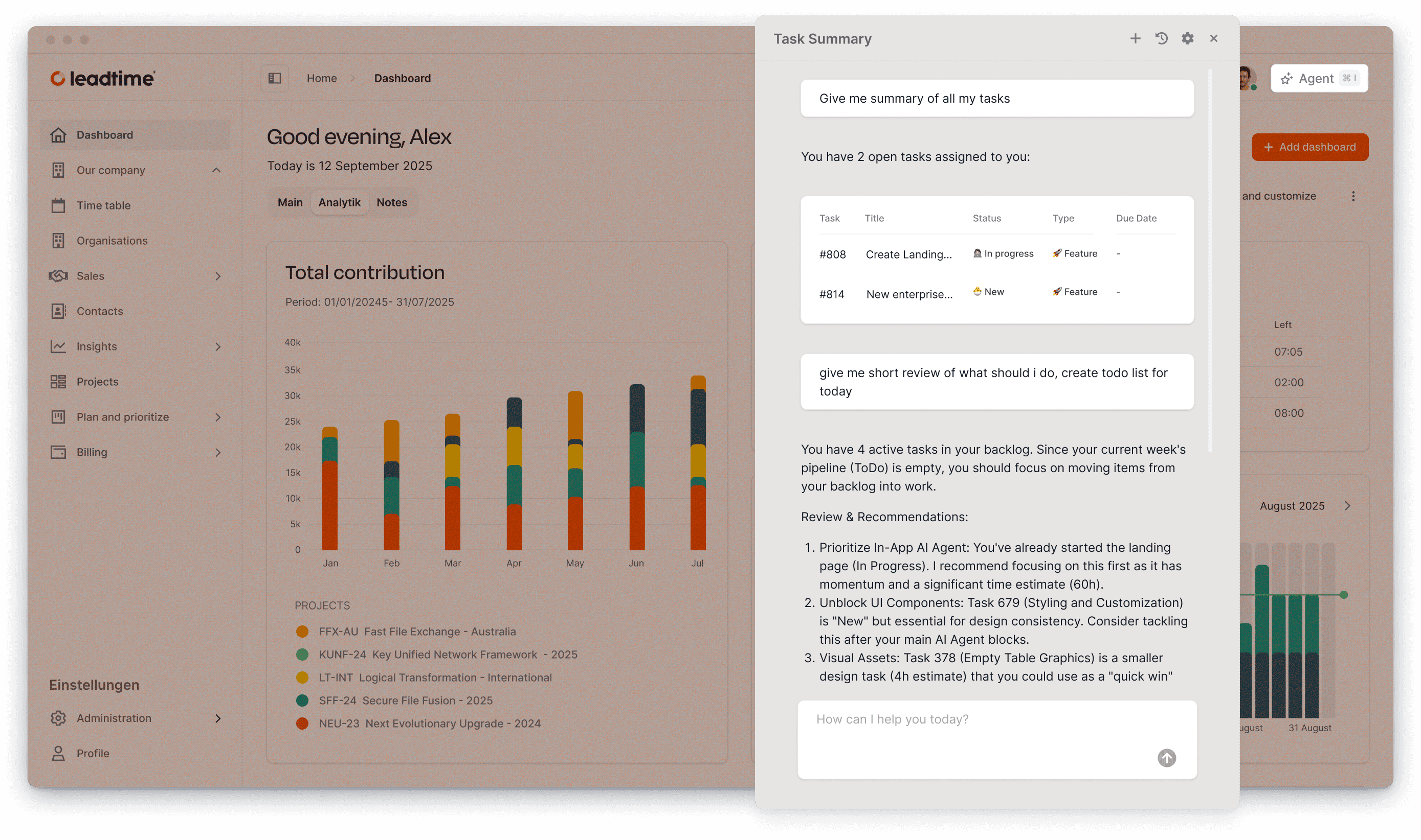 Der KI-Agent arbeitet direkt in deinem Leadtime-Workspace – mit Live-Daten für Antworten und Aktionen.